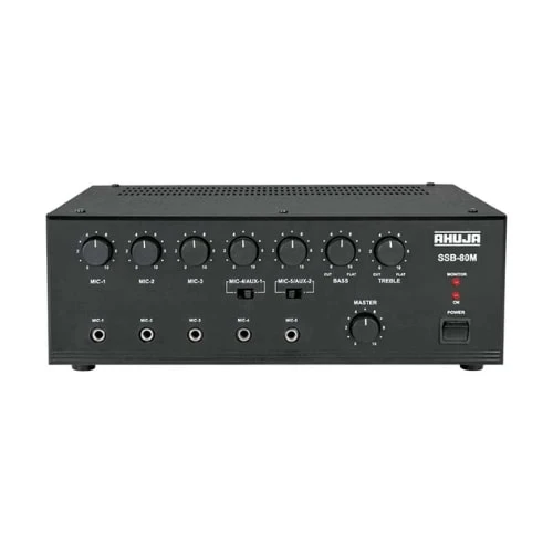 The Ahuja SSB-80M is a PA amplifier with 5 input microphone channels and 2 aux input channels. This amplifier can be used on 12-voltage batteries. Its maximum power output is 110W. This amplifier can instantly transfer to DC power when AC power fails.